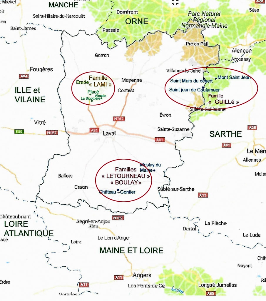 Annie Bienvenu, veuve de mon frère Guy, professeure et proviseure comme l’était Michel, est devenue experte en généalogie. Retraitée, elle a reconstitué les arbres généalogiques des diverses branches de nos familles. Très aimablement, elle a repris en détail non seulement les ascendances Lamy, mais aussi celles des Letourneau, Boulay et Guillé, ce qui nous permet de disposer, à partir des actes d’état-civil eux-mêmes, du maximum de documentation possible sur les ancêtres de Michel et de Louise, en remontant jusqu’au xviie siècle. Qu’elle soit remerciée pour son méritoire travail de fourmi, qui nous a ménagé quelques surprises !